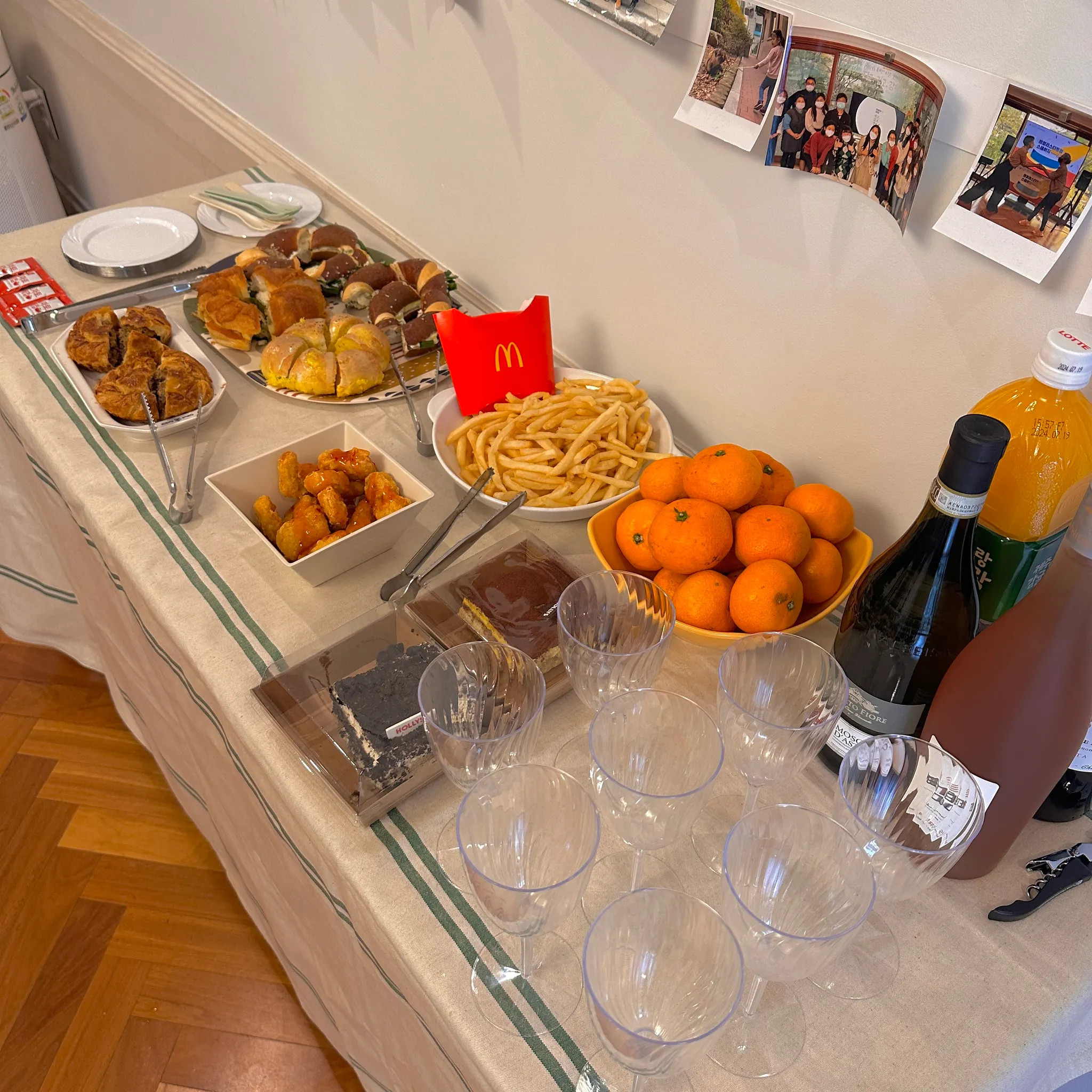 파티니까 가벼운 와인이랑 무알콜로 분위기도 냈네요. 포틀럭파티라 각자 음식을 가져왔는데, 저마다의 취향이나 스토리도 생각나는 음식들이었어요. 맥날덕후 민욱님의 프렌치프라이, 집 앞 맛집에서 가져온 미트파이, 자취생에게 부족할 수 있는 과일. 서로 생각하는 마음이 인상깊었네요.