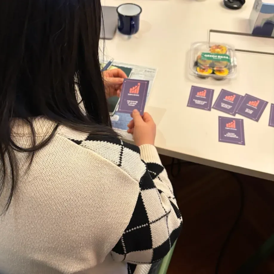 첫 번째로 투자 유형 테스트를 통해 나에게 맞는 투자 스타일을 찾는 것으로 시작했는데요, 나의 성향과 가치관을 토대로 준비된 질문에 스스로 답해보면서 나만의 투자 성향을 파악할 수 있었어요! 더불어 투자 스타일별로 참고하기 좋은 유익한 정보들과 추천 도서까지 다양한 정보를 얻어 갈 수 있었습니다. 이후 모임장 사환님이 자체 제작한 투자카드를 활용해 대화를 나눴는데요, 카드 속 질문에 함께 답해보면서 주식에 대한 서로의 가치관과 경험담을 공유해 볼 수 있었어요
