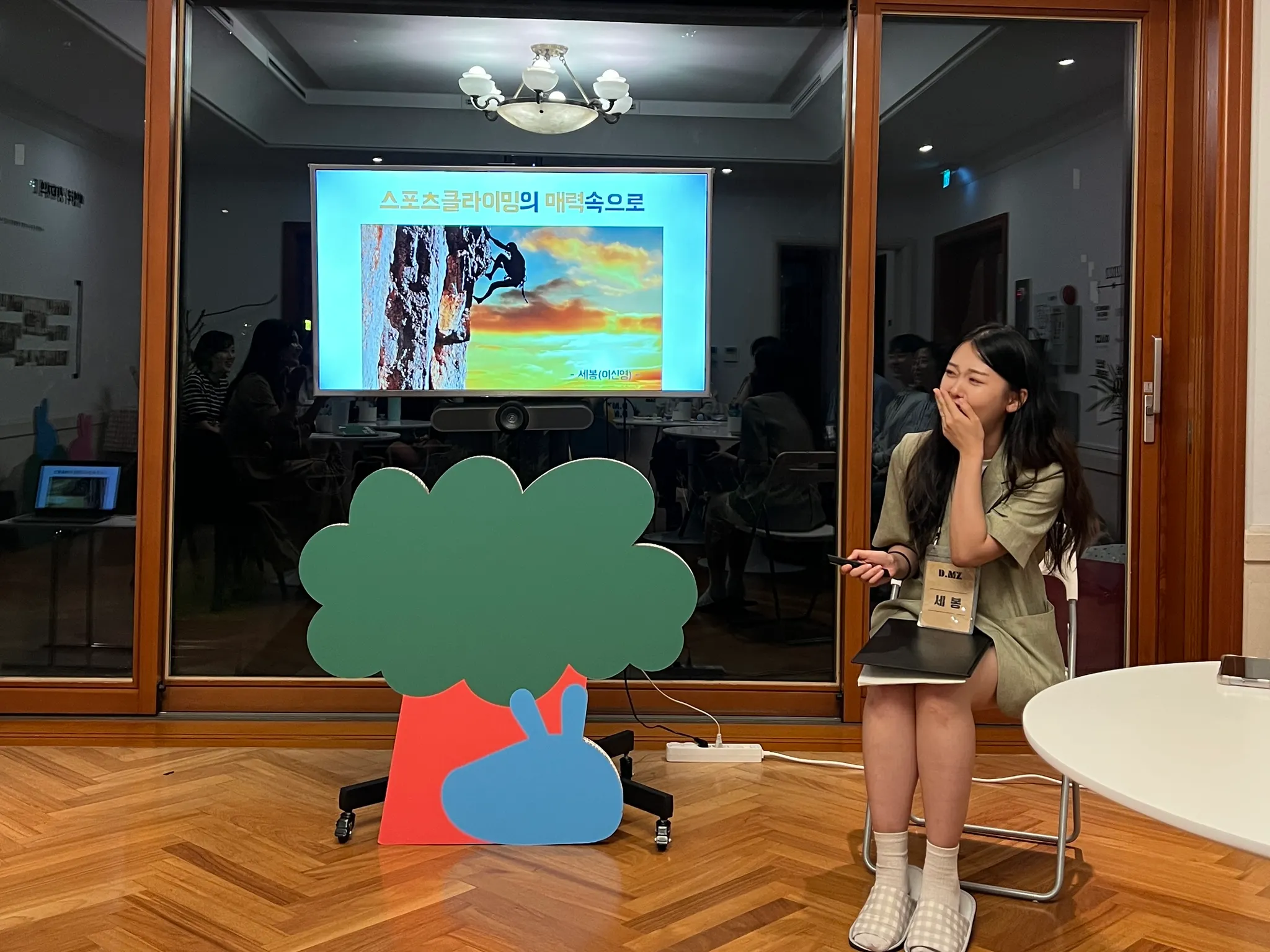 그 밖에도 본인이 즐겨하는 스포츠인 클라이밍의 역사부터 규칙과 꿀팁 등 참가자 모두를 클라이밍 박사로 만들어 주었던 참가자, 모든 참가자의 닉네임으로 N행시를 지어와서 모두에게 응원과 위로를 선물해 기립박수를 받은 참가자까지 다양한 발표들을 들어볼 수 있었어요!