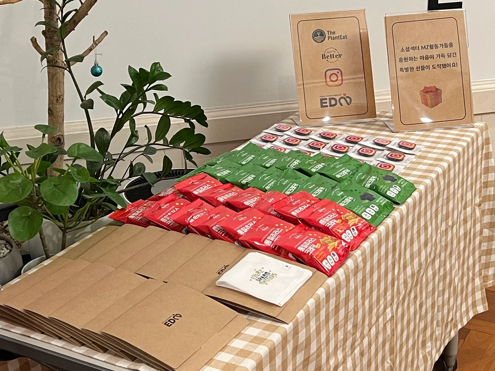 마지막 모임인만큼 참가자분들을 위한 맛있는 저녁식사를 준비했는데요, 거기에 더불어 소셜섹터 MZ활동가들을 응원하는 마음을 가득 담아 더플랜잇, 인스타그램, JYP에서 선물을 보내주셔서 더욱 풍성한 모임이 될 수 있었어요!