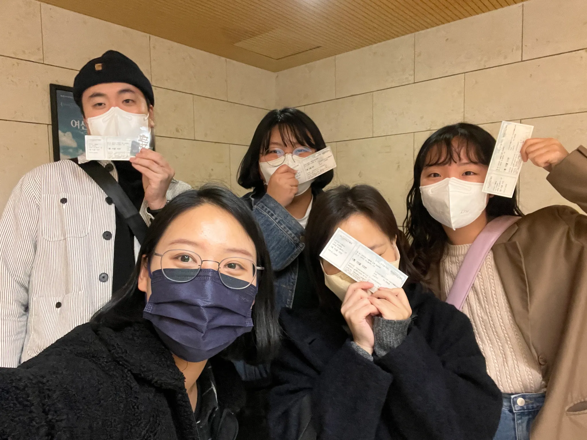 첫 모임에서 추천했던 공연들 중, 뮤지컬 <여신님이 보고 계셔>를 5명의 활동가들이 함께 관람하기로 하였습니다. (코로나19 확진으로 격리해야 했던 유리님을 제외하고ㅠㅠ)